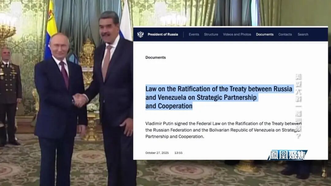 俄罗斯与委内瑞拉关系良好,当地时间2025年10月27日,俄罗斯总统普京签署法律,正式批准《俄罗斯与委内瑞拉战略伙伴关系与合作条约》。11月2日,俄罗斯总统新闻秘书佩斯科夫表示俄方将密切关注委内瑞拉局势发展。